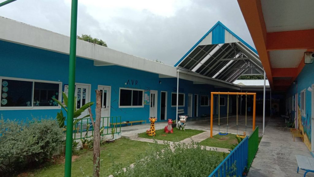 PlaygroundLibrary and Computer RoomDining RoomNurserySchool BusesOff Campus: Tennis Courts and Swimming PoolBuildingDining Football FieldParkingPlayground